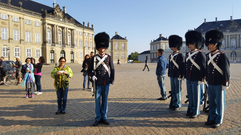 丹麥皇家衛兵列隊換崗,別看高聳的皮毛帽子,在夏季據說具有移動新風功能(隱蔽內置風扇)